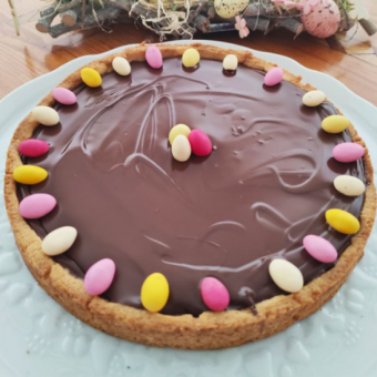 Cassez le chocolat et faites bouillir la crème. Versez petit à petit la crème très chaude sur le chocolat et mélangez en même temps. Une fois votre ganache refroidie, mettez-la sur la pâte cuite et refroidie également. Placez l’ensemble 1 heure au réfrigérateur.